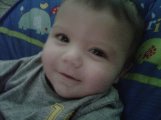 Things have been really busy at our house lately! Our little boy is on the move! We put him in his walker and he takes off! I can put him in on one side of the kitchen and before I can even walk to the sink he is right at my heels! He's a fast little guy! He especially loves when daddy is home, he will take off in whatever direction daddy happens to be. Lately, Tripp has been especially fascinated with the trash can! I have to keep that sucker as clean as possible because he will zoom over in his walker and grab that can! This morning I walked over to the bathroom to get a towel and when I came back tripp had zipped across the kitchen and was trying to put part of the trash bag in his mouth! yuck!! mommy has to watch very closely these days!! Tripp also likes to roll and scoot around all over the carpet! I can't leave him alone for a second or he'll scoot himself all the way across the room and try to grab something hes not supposed to have. The mischief has already begun!